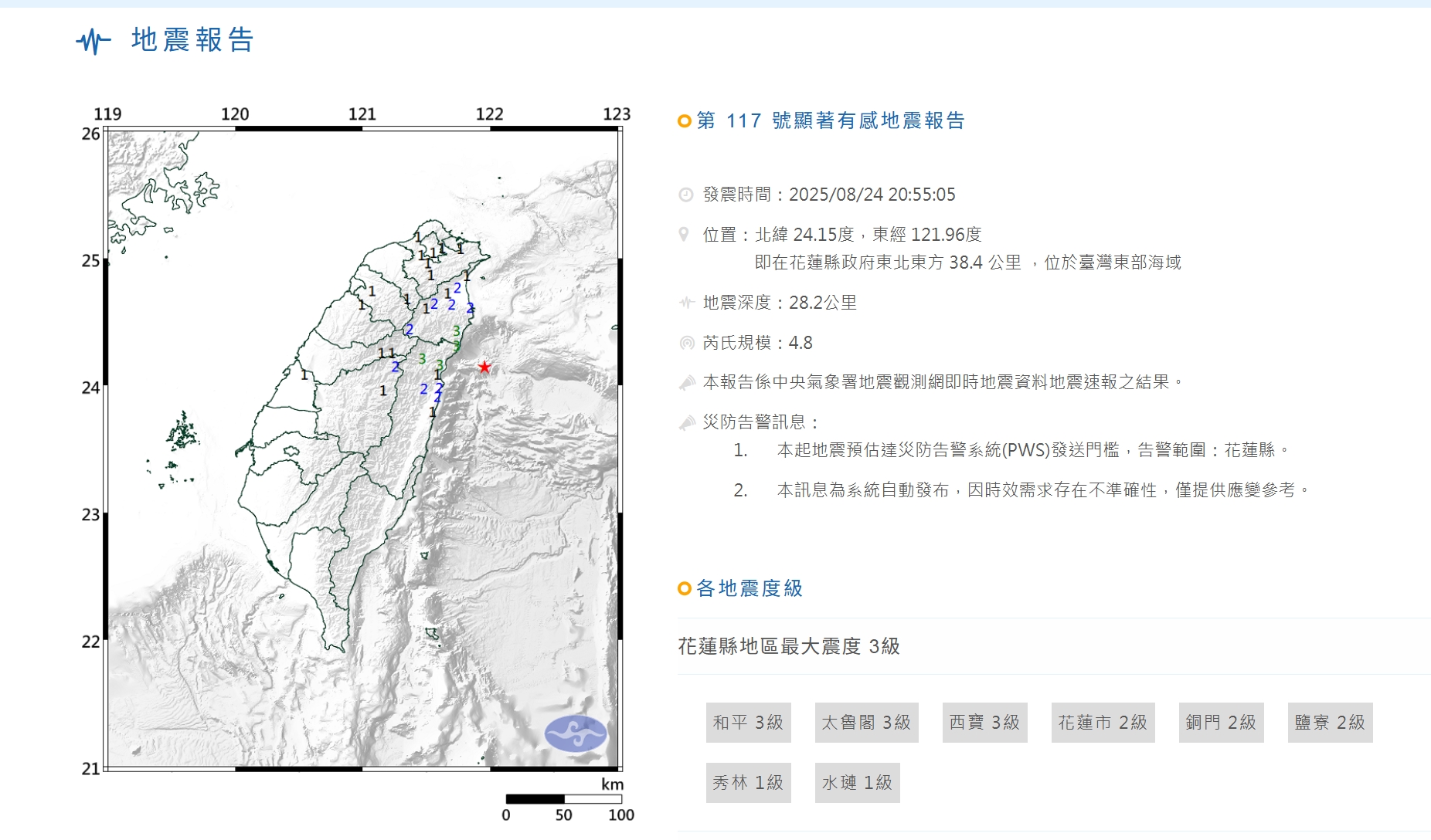 花蓮晚間地牛翻身!宜蘭、花蓮震度3級以上.(圖/翻攝 中央氣象署 網站)