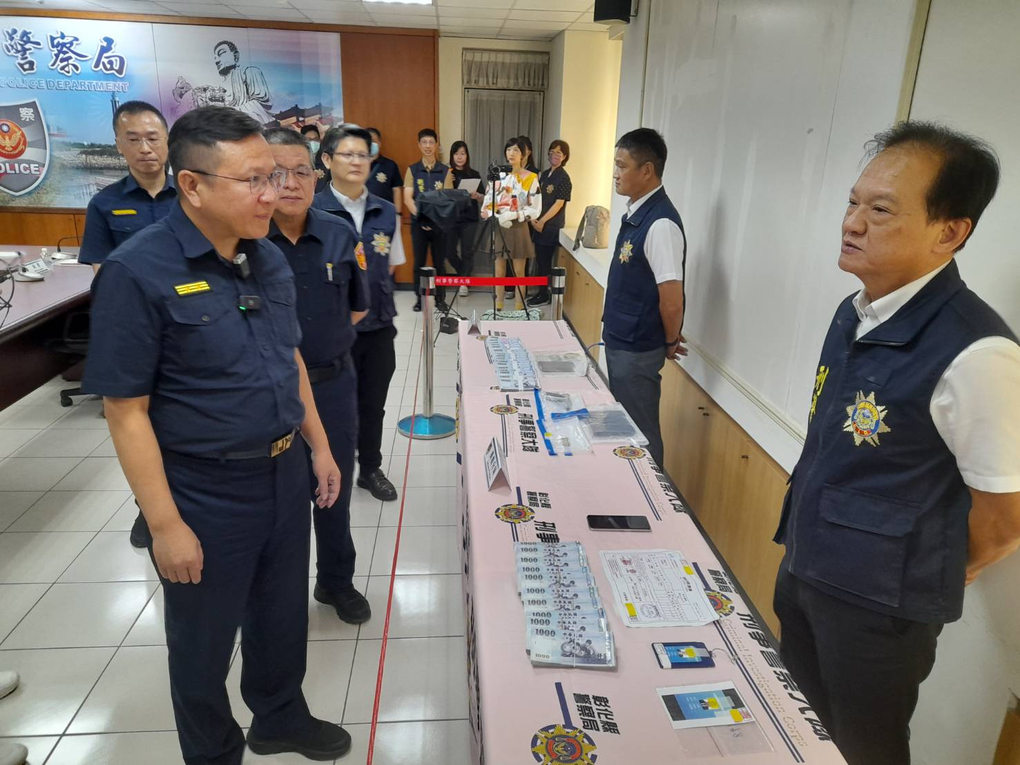 圖說:員林、鹿港分局向陳明君報告攔獲詐騙金額、槍枝成果