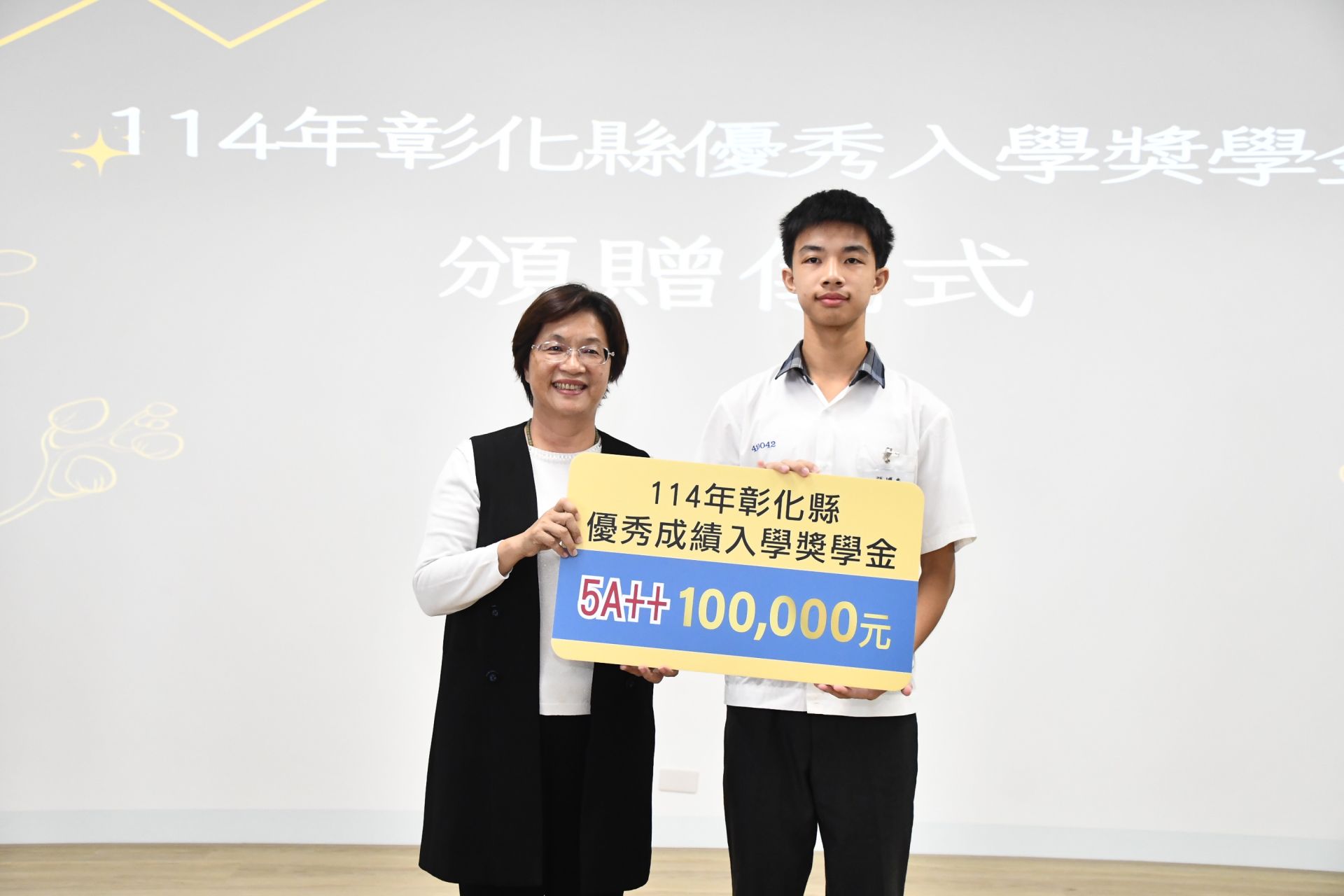 圖說:王惠美頒將學金給5A++滿級分的和美高中張博泰同學