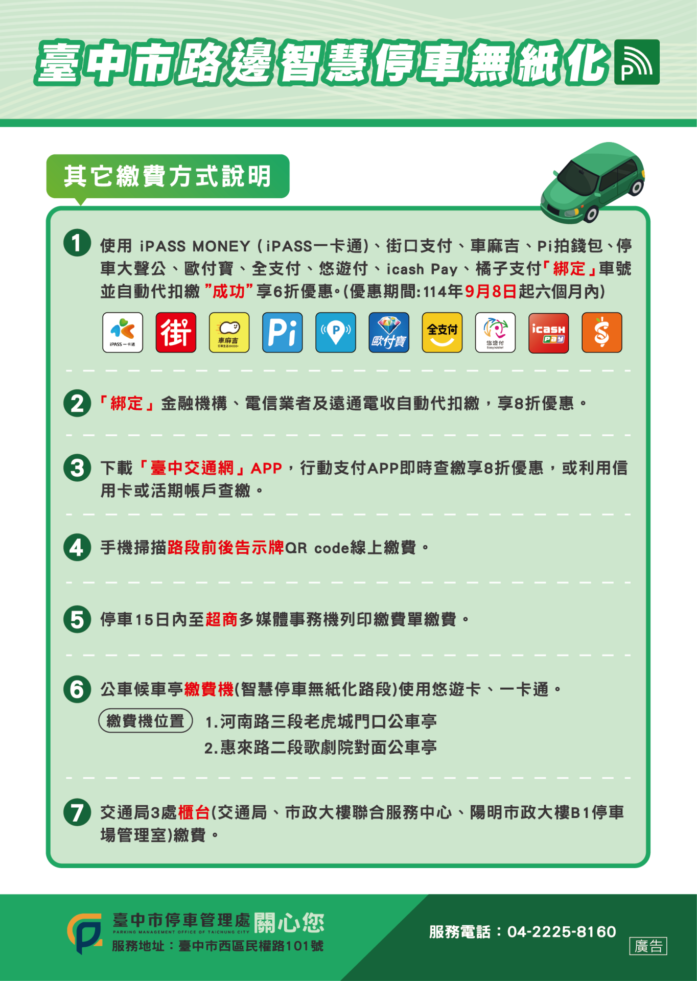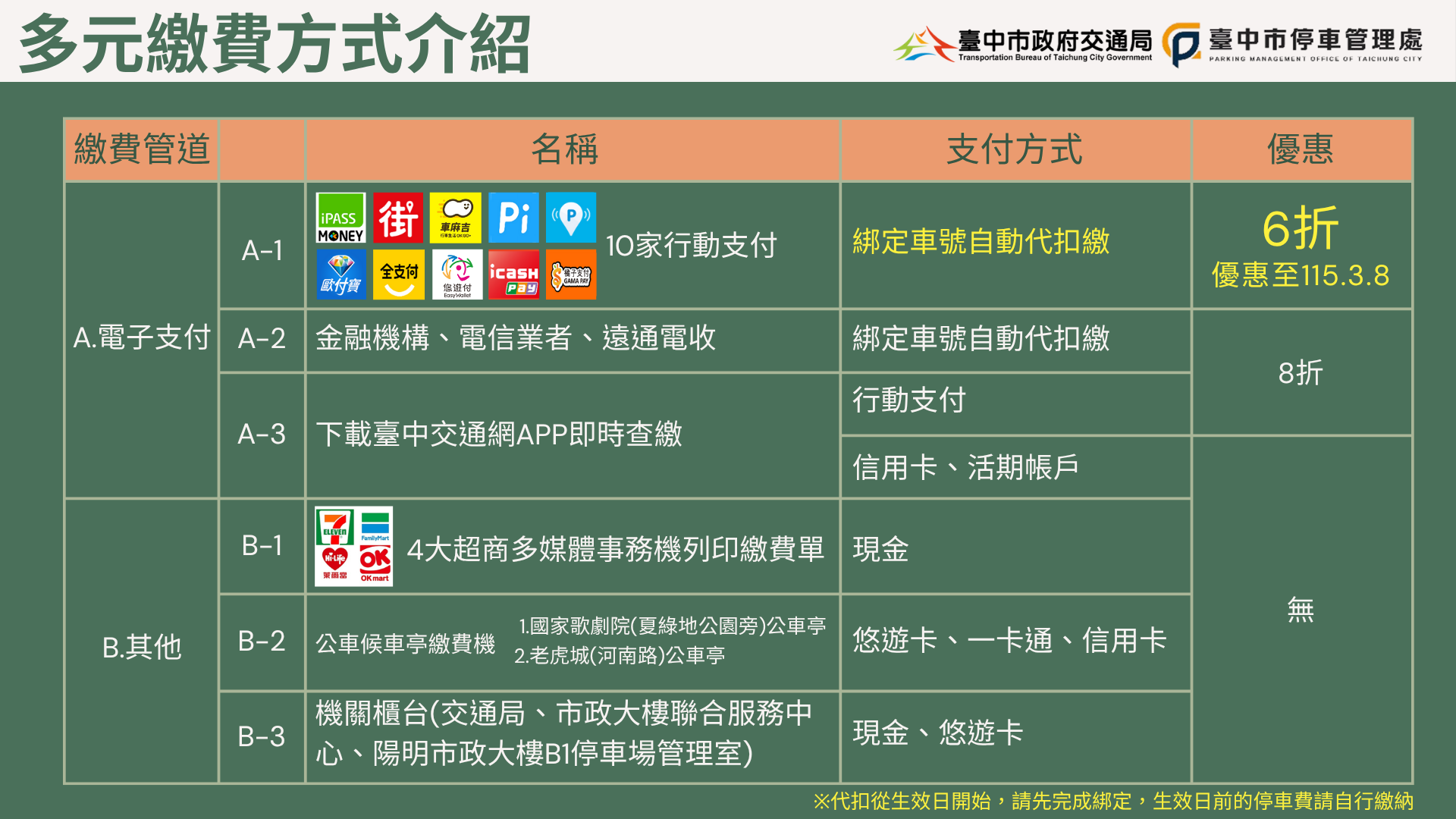 為方便民眾使用,交通局攜手多家廠商拓展多元多樣的繳費方式:車號可綁定包括iPASS MONEY(iPASS一卡通)、街口支付、車麻吉、Pi 拍錢包、停車大聲公、歐付寶、全支付、悠遊付、icash Pay及橘子支付等10家行動支付,綁定自動代扣繳成功在無紙化路段最高享有「6折優惠」(優惠時間至115年3月8日)。或透過金融機構、電信業者與遠通電收的自動代扣最高享有8折優惠;亦可透過「台中交通網」App連動綁定車號繳費。