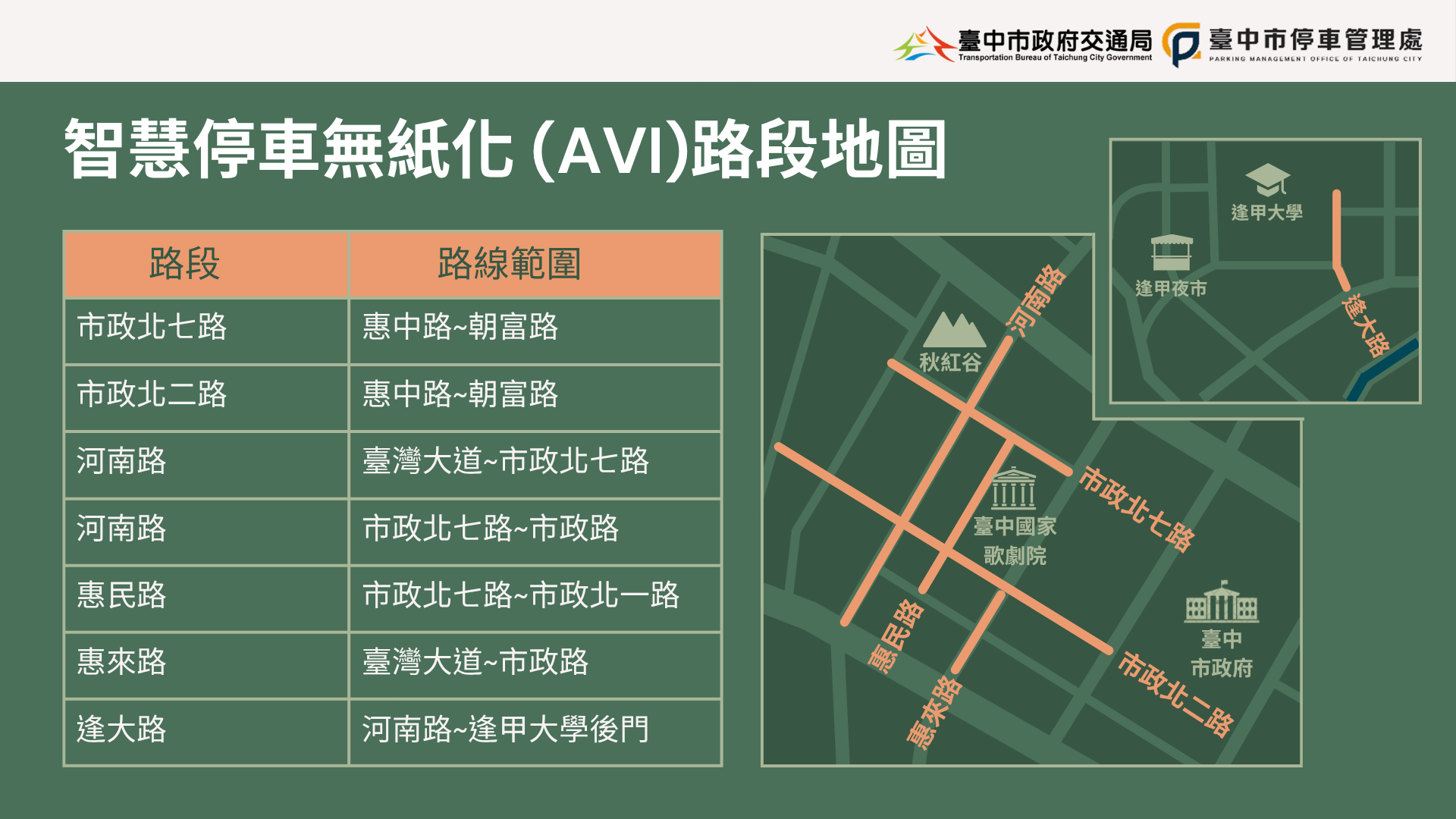 本次建置共涵蓋市政北七路、市政北二路、河南路、惠民路、惠來路與逢大路周邊,合計297格智慧車格,車位內繪製綠底白字「P」LOGO圖樣,並設置可掃 QR Code繳費的停車指示牌。民眾停車後,可透過行動支付付費,不再仰賴紙本繳費單。