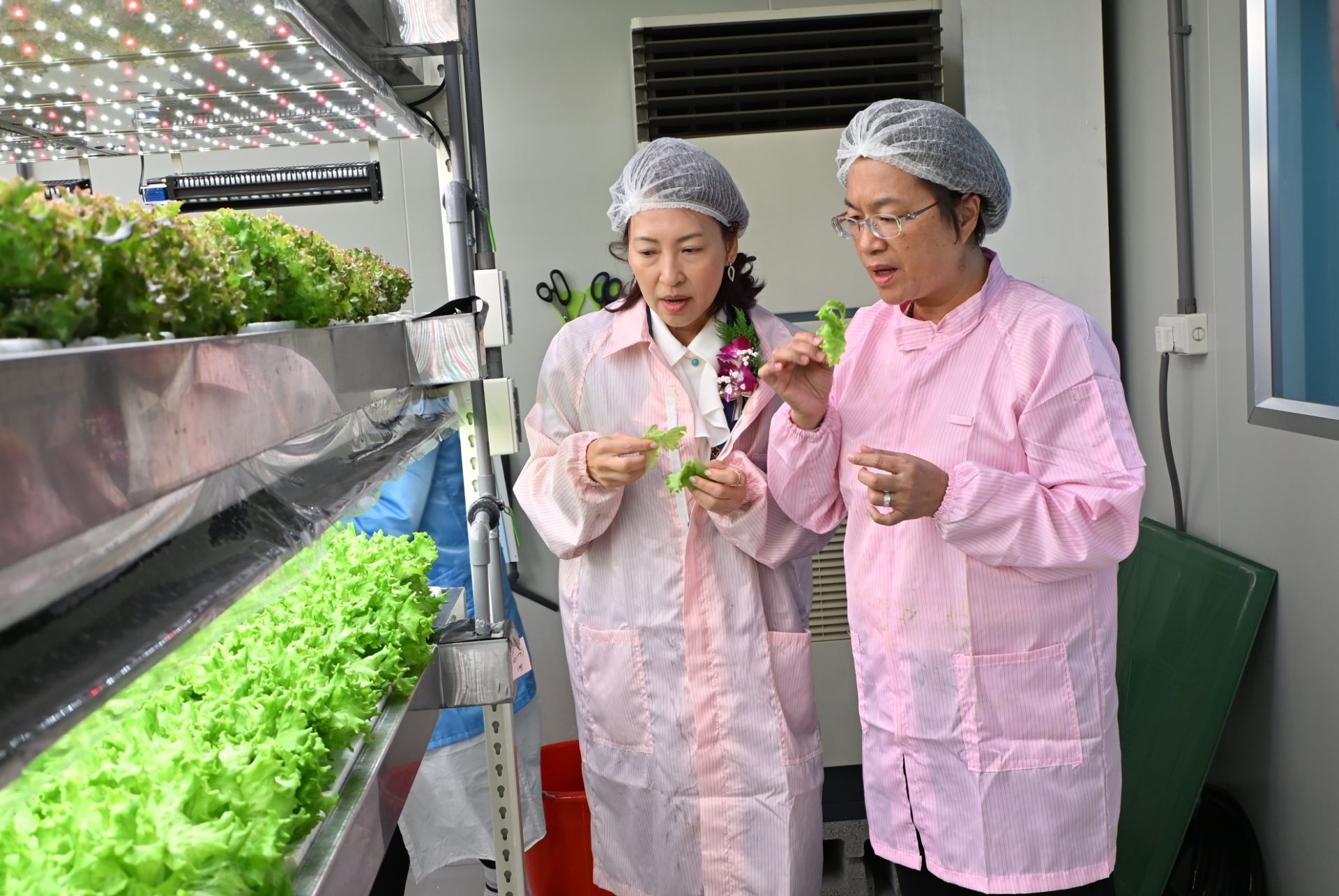 王惠美指出,來自社頭鄉的五位劉姓姊妹,自2019年起懷抱「安心享食」的理念與使命,返鄉創立品牌,結合科技與農業,用心培育每一株水耕蔬菜。透過全環控技術有效節省土地資源、降低環境負擔,也能穩定產量與品質,展示現代農業的創新能量。其以「菜季滿滿」以「安心享食」為核心理念,透過垂直農場與全環境控制系統,讓蔬菜在最佳條件下生長,消費者也能吃得安心。這不只是生產蔬菜的地方,更是一個承載對土地、健康與未來關懷的創新場域,用實際行動守護全民飲食安全。