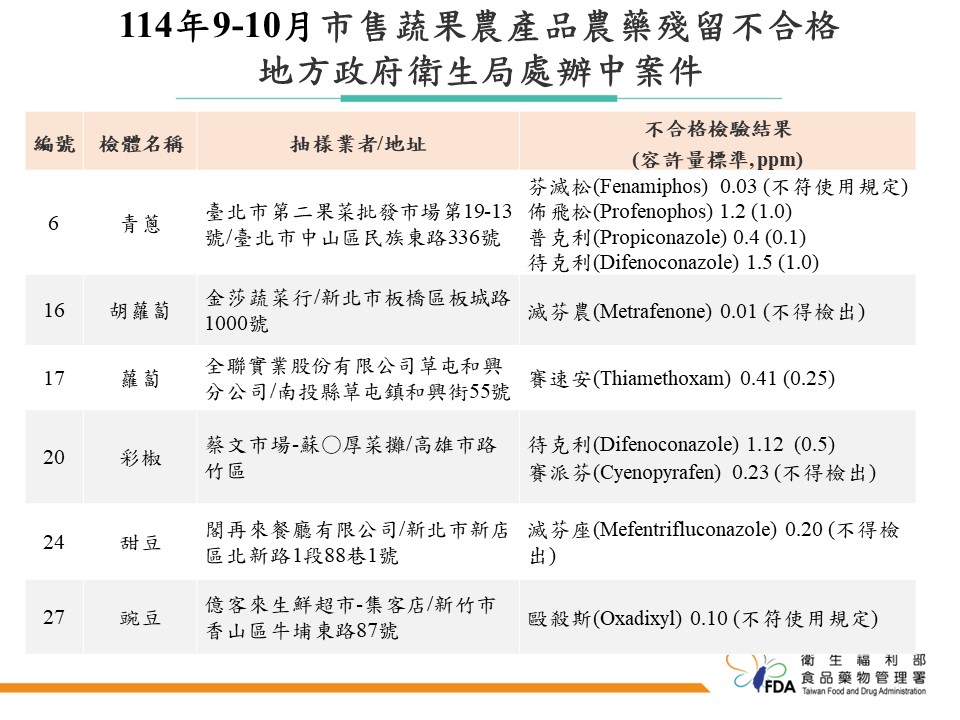 目前所有不合格產品均已要求下架回收,並針對無法交代來源或涉及違規的供應商開罰 30 萬元。可追溯來源的國產農產品也已移請農政單位持續追查。