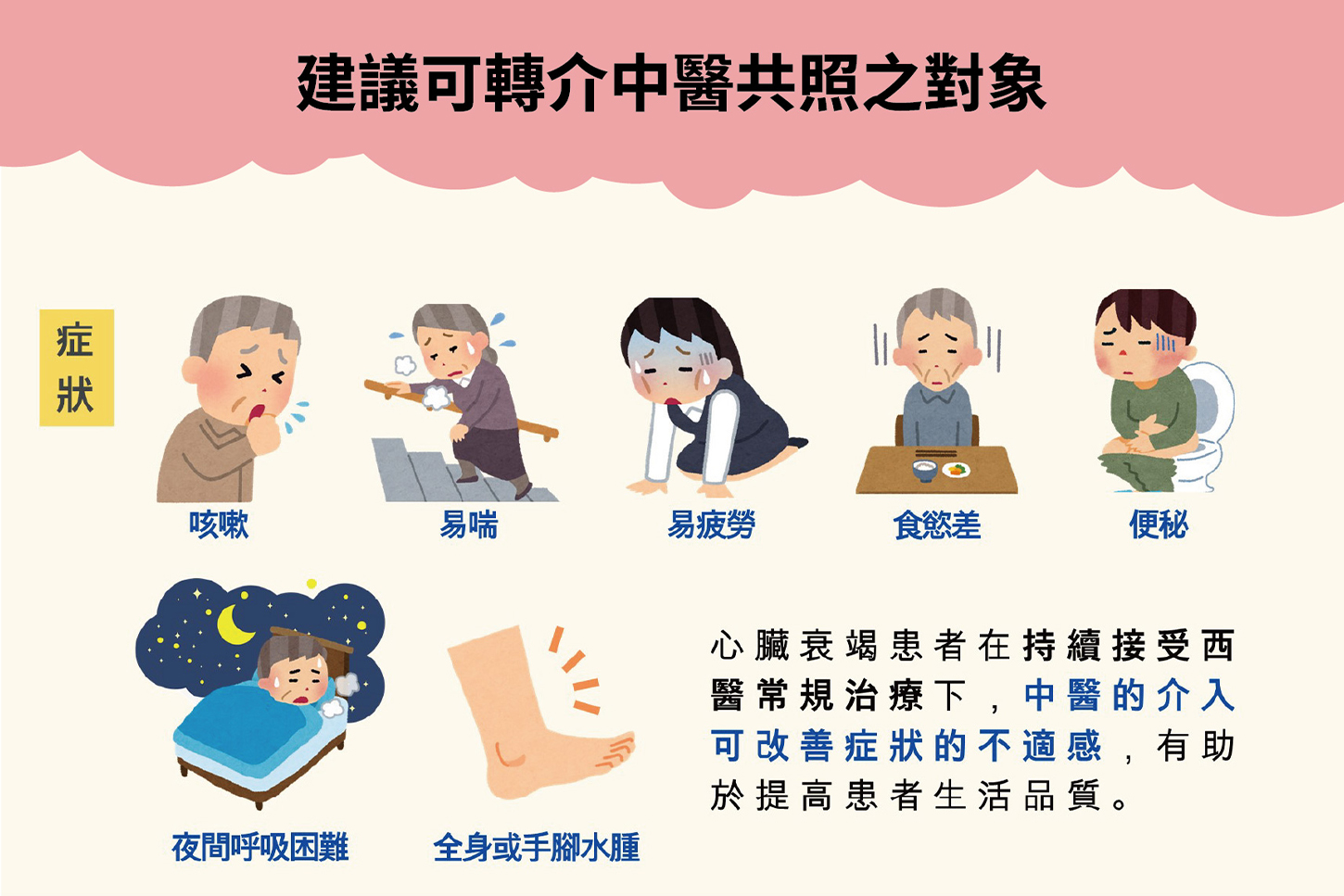 中醫部副主任陳運泰醫師則說明,中醫在心衰竭治療中扮演的是優化治療效果的角色,重點在於整體調理與支持身體功能,例如提升體力、改善疲勞與呼吸困難,協助患者在長期治療中維持較佳生活狀態。中醫將心衰竭常見證型歸納為:心陽虛衰型、氣陰兩虛型、氣滯血瘀型、痰濁阻肺型。中醫藥治療強調整體觀與辨證論治,依不同體質與症候型態,提供個別化調理方案,作為現代醫療的重要輔助。