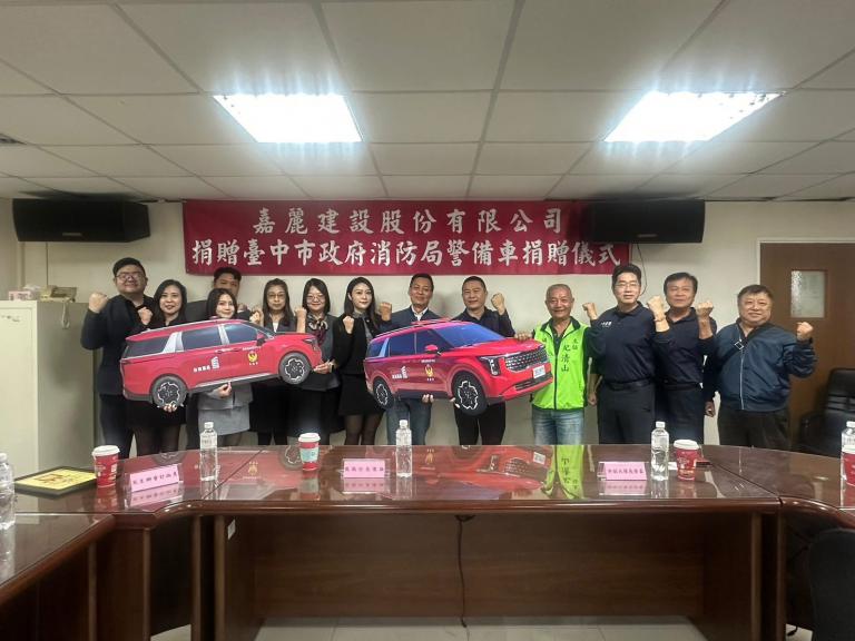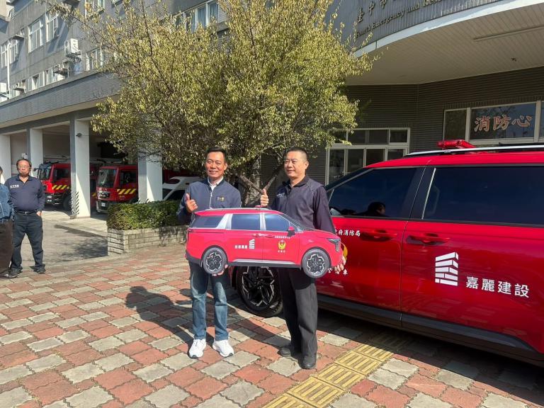 ▲嘉麗建設捐贈消防局第四大隊 1 台消防警備車,執行長熊俊雄(左一)代表公司交付。(圖/嘉麗建設提供)