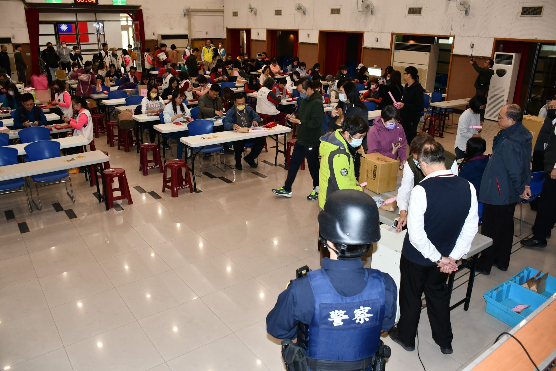 圖說:近百公所里幹事、志工忙著分裝春節禮金 彰化警方派員警荷槍實彈在現場戒護