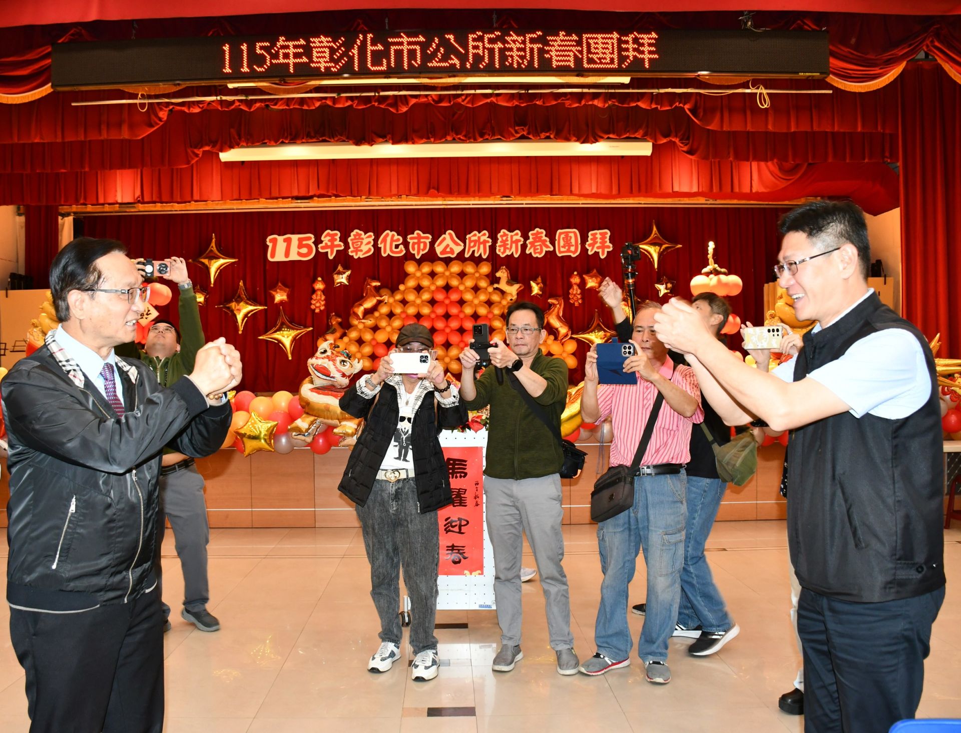 圖說:彰市長林世賢和市代主席陳文賓代表公所里鄰長及市代表互相拜年