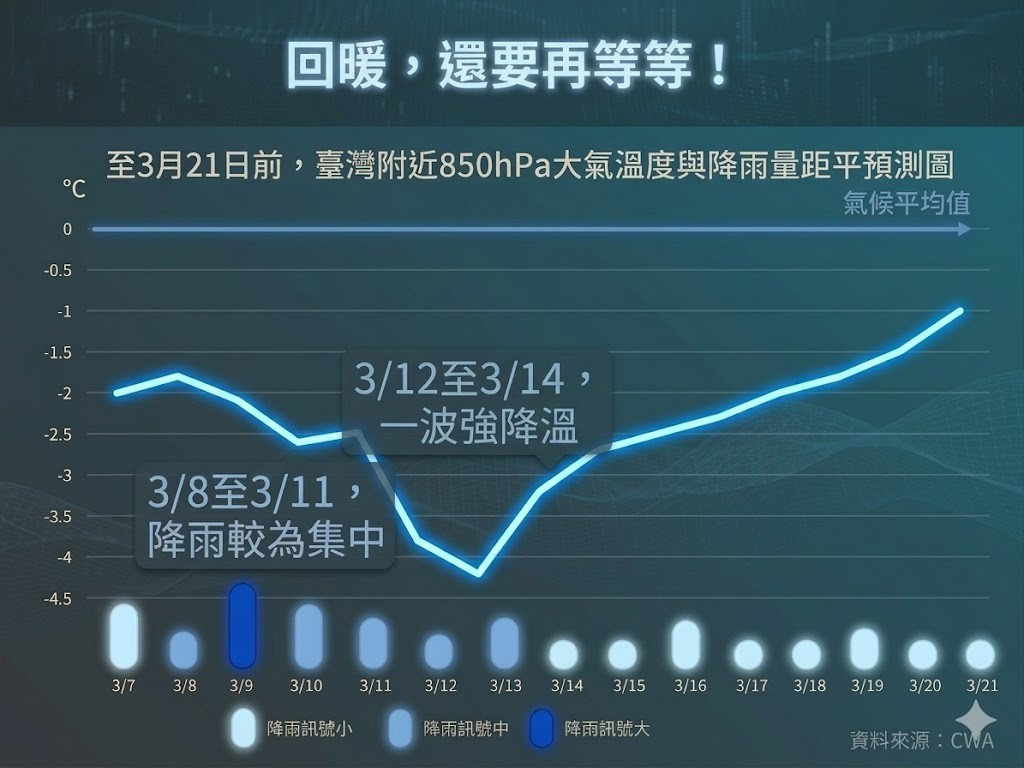 氣象署強調,整體來看,3月下旬以前氣溫大幅回暖的機會不大,衣物穿著仍需保守因應,洋蔥式穿法還是目前最保險的選擇。春天,再等等。