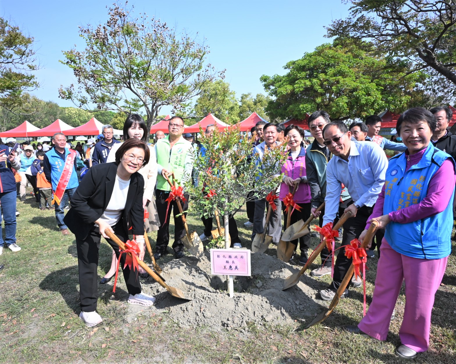 「彰化縣115年植樹活動-原地扎根•韌性森活」活動,15日有來自社區、學校、企業等各界夥伴齊聚埤頭鄉豐崙公園,親手將樹苗扎根鄉土,活動現場設置政令宣導攤位及手作植栽DIY,並提供金毛杜鵑、蘭嶼羅漢松、厚葉石斑木、七里香等原生樹苗各500株,共2,000株,開放民眾現場領取。王惠美縣長表示,植樹不僅是種樹,更是為土地播下希望的種子。