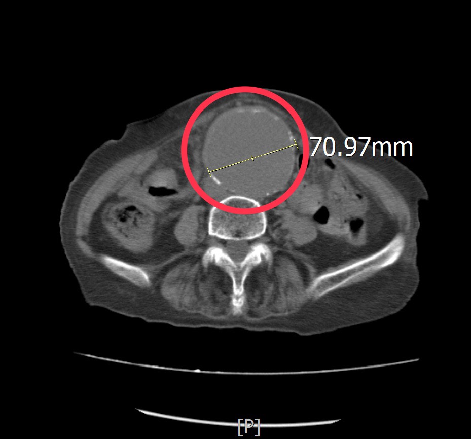 這位高齡患者由家屬陪同到急診求診時,一再強調她左側下肢痠痛及腰部不適,但並沒有明顯外傷史,其疼痛指數已達到8至10分,為了快速釐清病情,孫秀正醫師立即為病人進行床邊超音波檢查。透過即時影像檢查,發現患者的腹主動脈明顯擴張,直徑已超過7公分,高度懷疑為腹主動脈瘤,進一步安排電腦斷層檢查確認診斷,結果顯示確實為大型腹主動脈瘤。