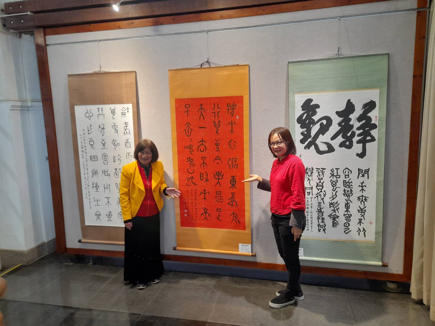 圖說:前國大陳美子(左)、總幹事楊英鳳邀請大家到彰化藝術館欣賞學員的創作聯展