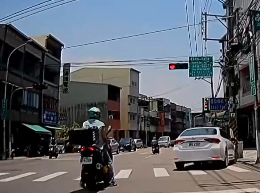 白色自小客車駕駛闖紅燈還下車嗆外送員。翻攝Threads