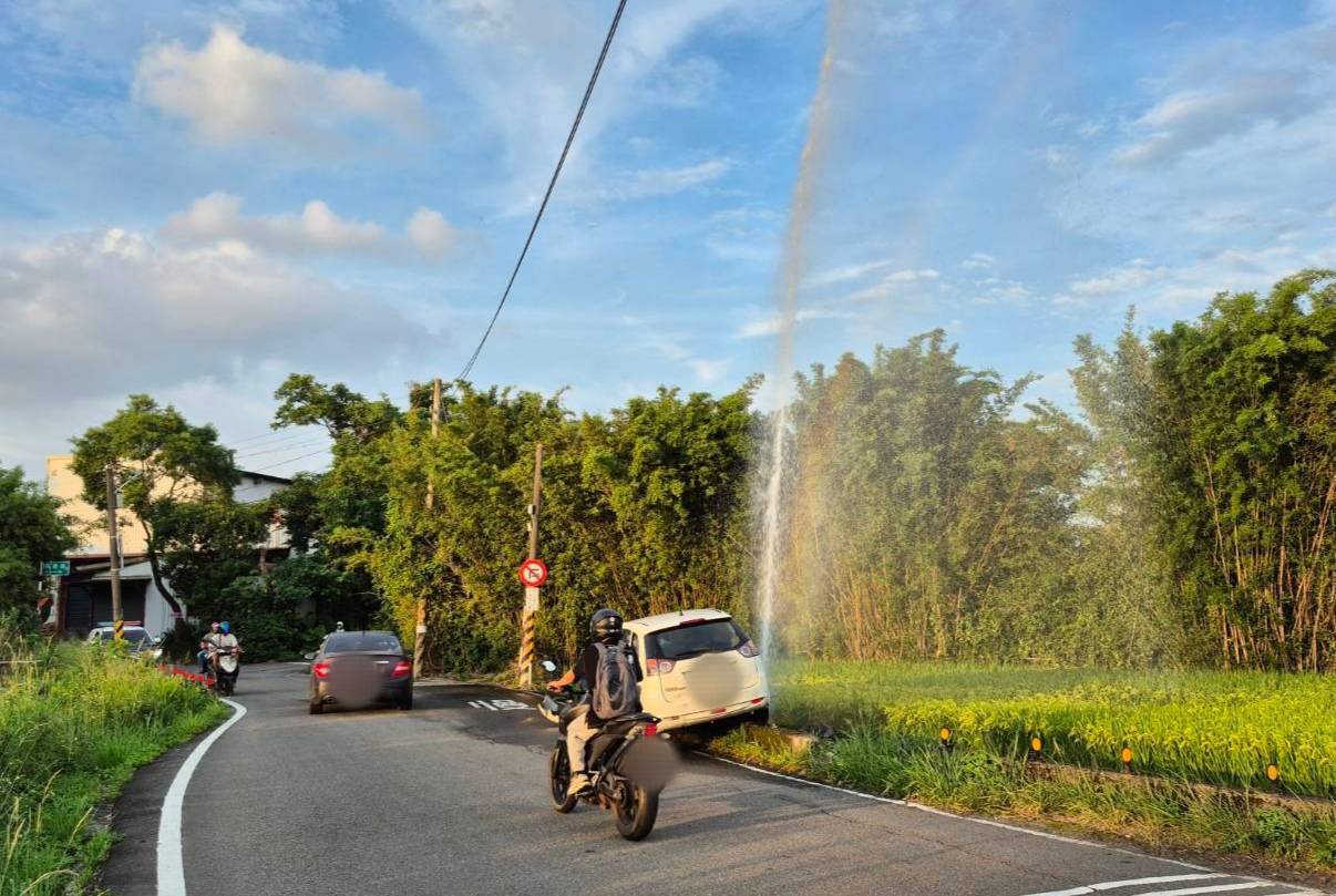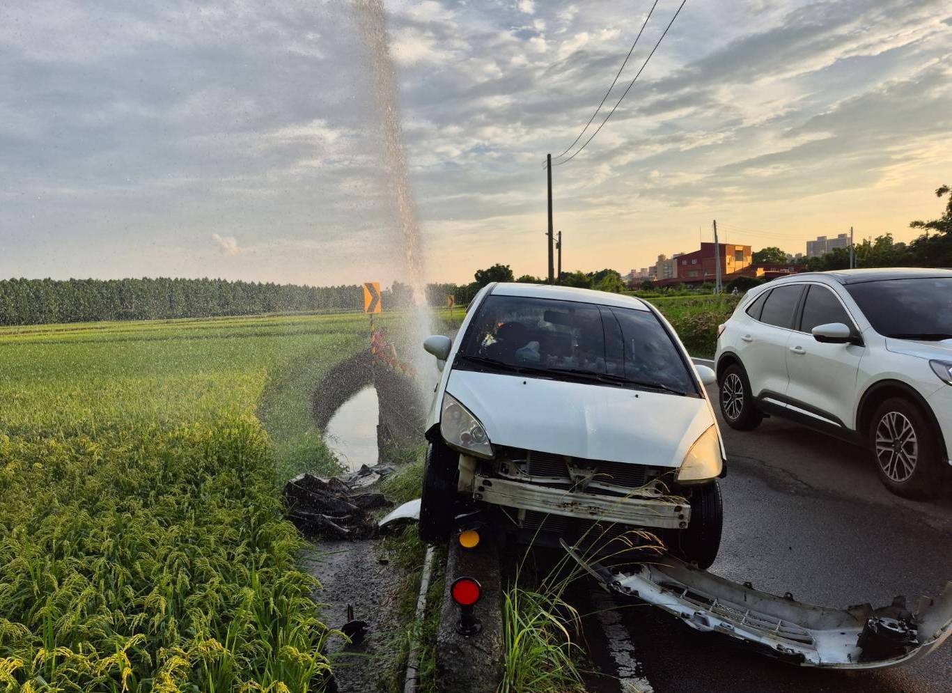 自小客車撞破路邊水管形成噴泉。翻攝畫面