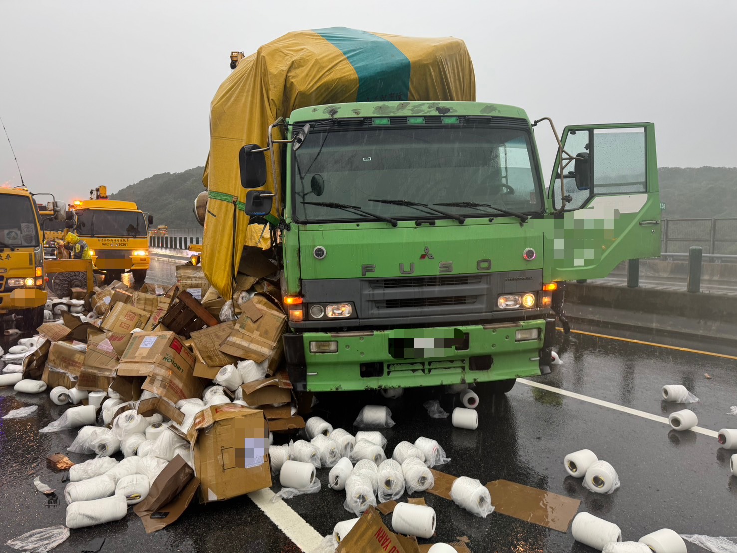 國道3號西湖路段3輛大型車追撞! 載運針織布散落佔兩車道