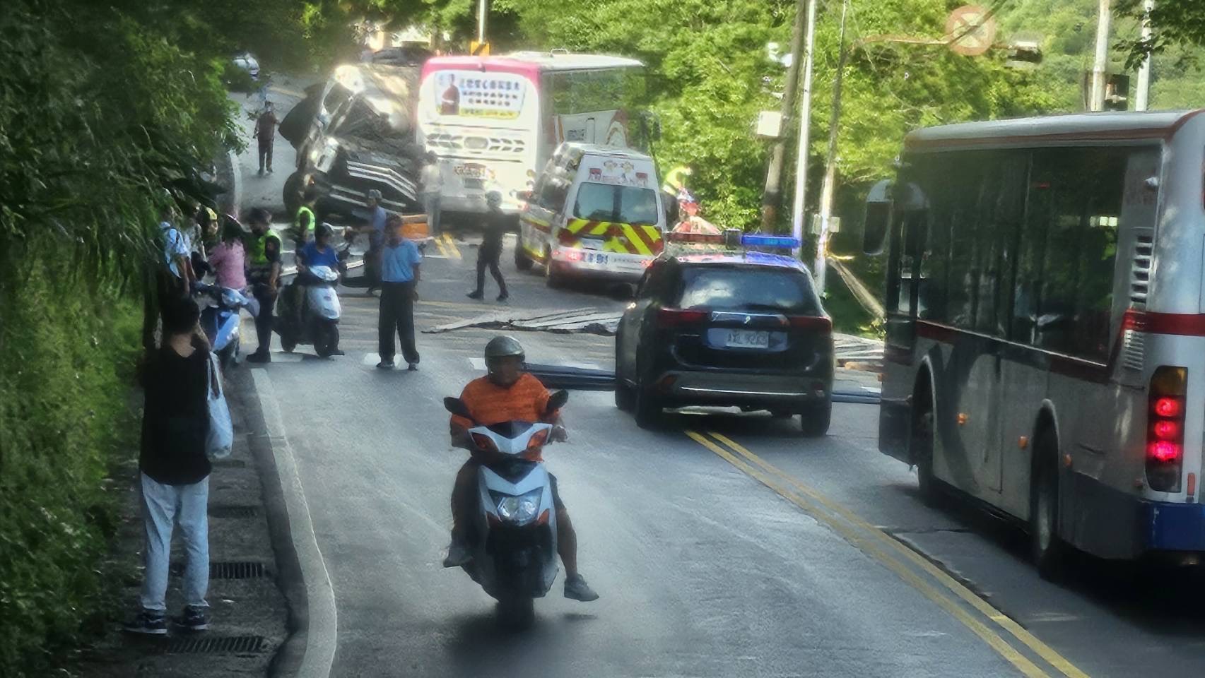 新北市萬里區中福路國光客運和砂石車相撞,砂石車上載運鋼條散落一地,一輛路過機車險遭波及,令人述目驚心!翻攝畫面