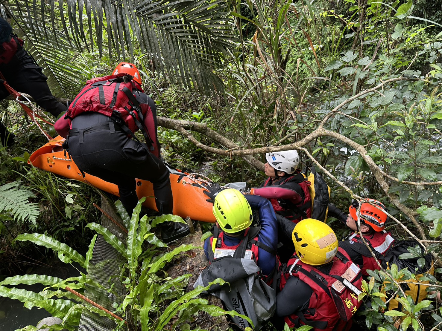 消防隊員將溺水溯溪教練送上救護車。翻攝畫面