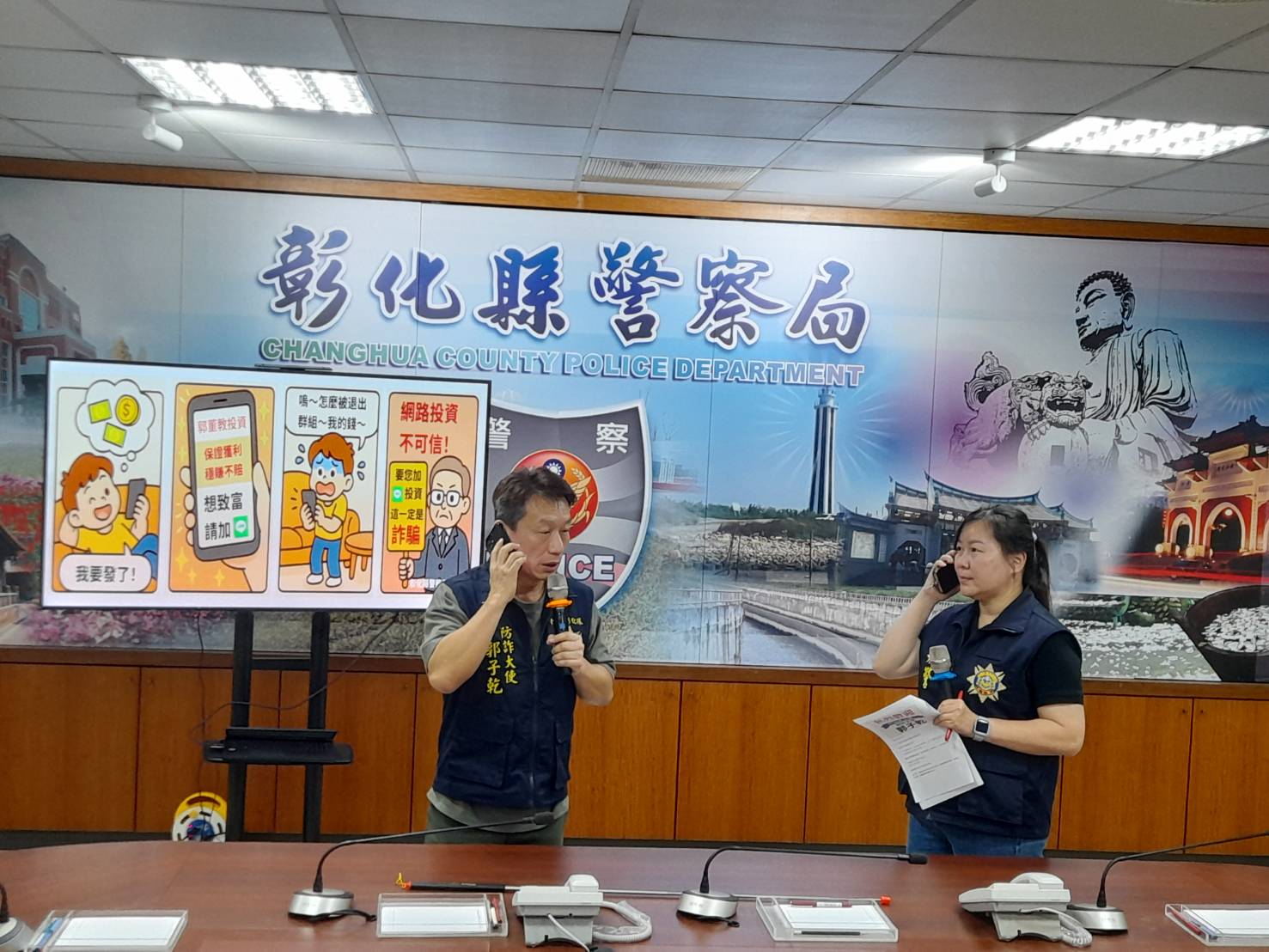 圖說:郭子乾到彰化縣警局模擬詐騙手法,提醒民眾遇有可疑要打110或165專線(曾厚銘攝)