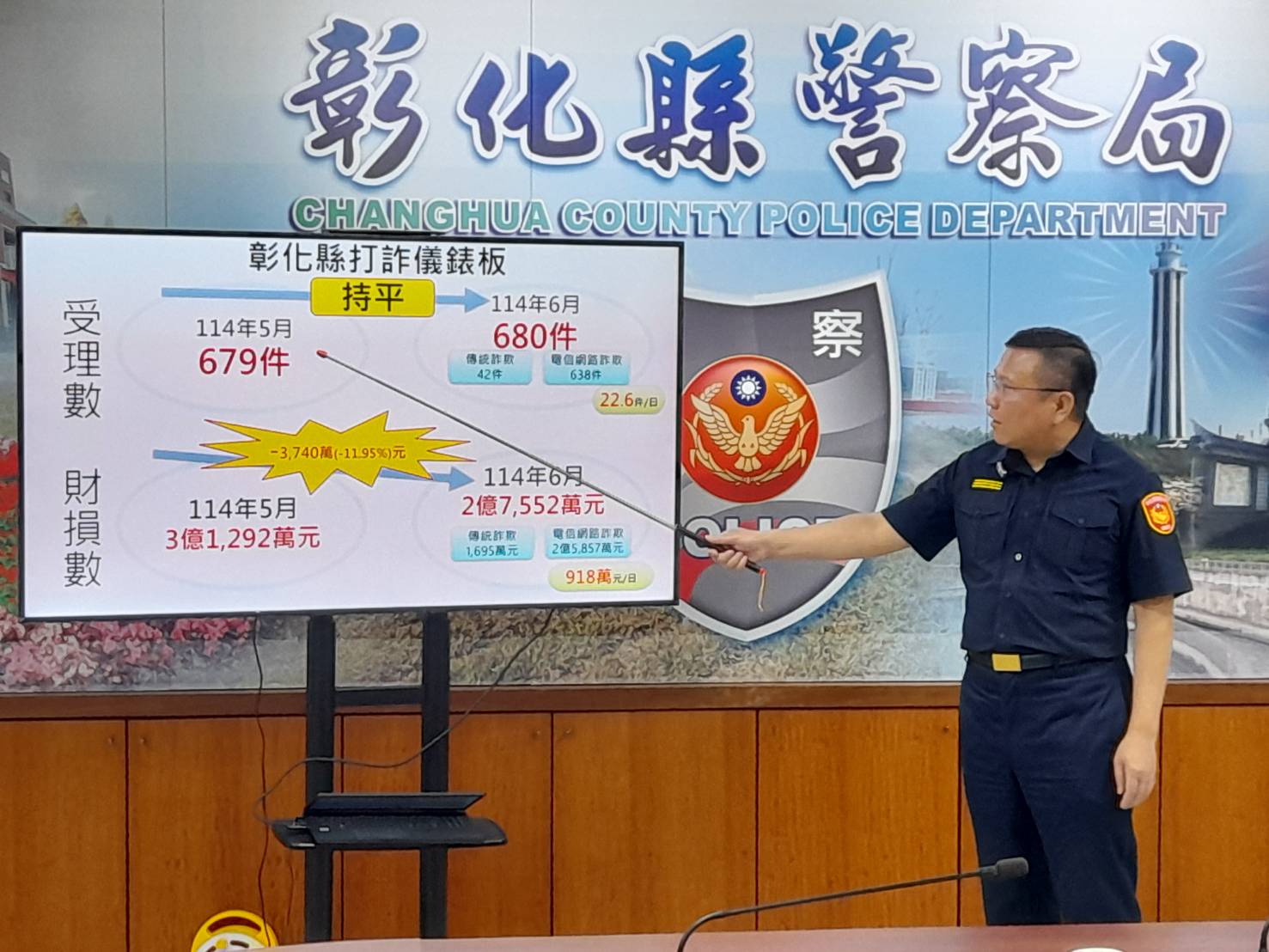 彰化縣警局統計114年6月份受理件數680件及財損數新臺幣2億7,552萬元;以每十萬人口數統計,彰化縣6月份平均受理詐欺案55.29件,平均財損金額約2,240.4萬元。局長陳明君指出,統計發現以假投資最多,網路購物詐騙也有明顯增多,另年輕人也是受騙入數最多,女性多於男性。陳明君並呼籲民眾踴躍檢舉,如車手等遭裁定交保、聲請羈押等處分,每案給予檢舉民眾獎金1萬元。