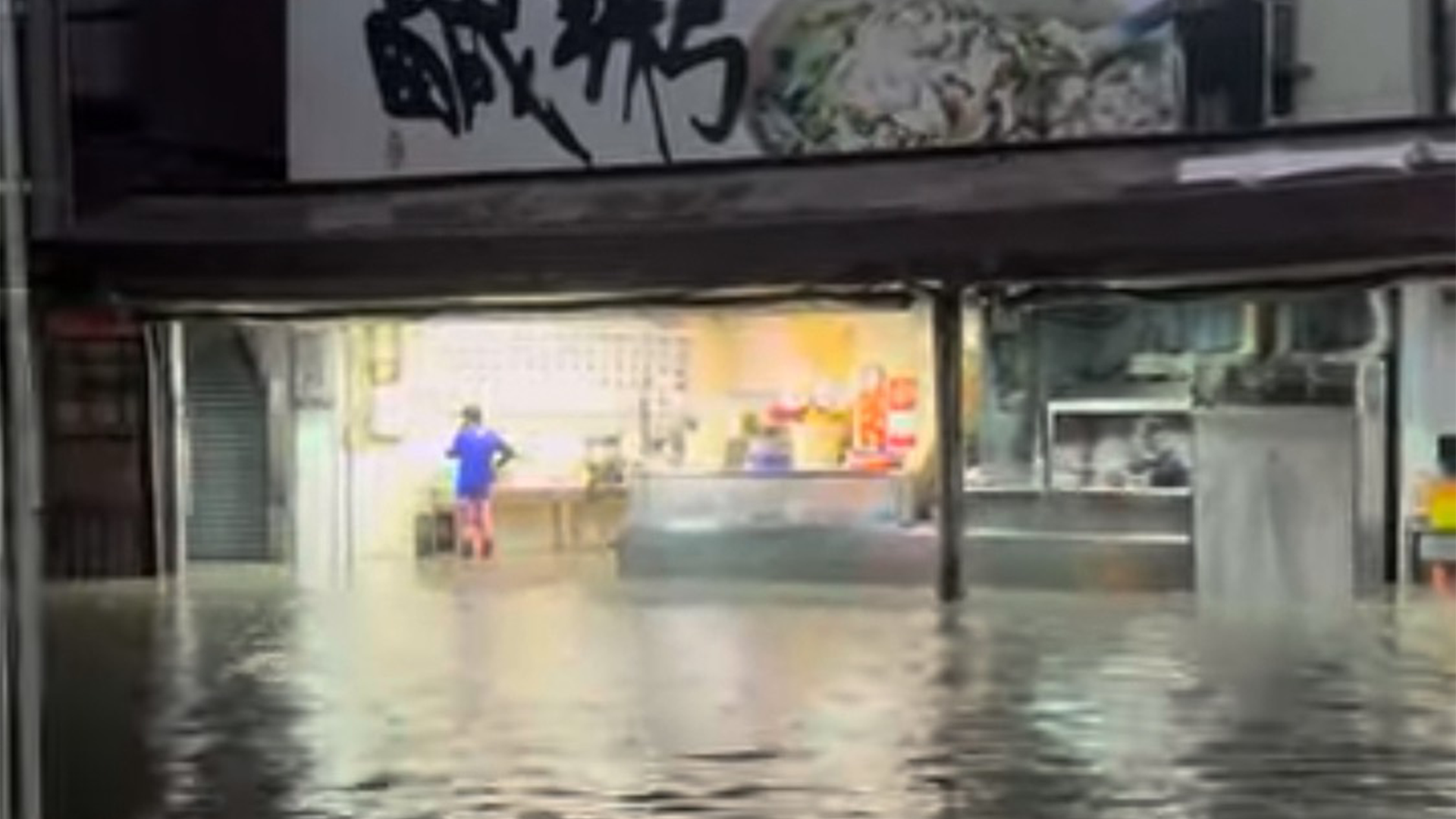 小西門圓環因排水宣洩不及,積水從人孔蓋狂冒而出,彷彿馬路自帶噴泉機制,民眾經過全被嚇傻。而距離圓環不到百公尺的「阿堂鹹粥」,清晨時段正值用餐高峰,卻因店內進水,員工只能一邊打掃一邊安撫顧客,導致營業大受影響。