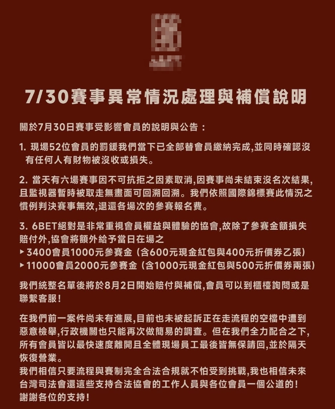 業者則發布聲明指出, 現場52位會員的罰鍰我們當下已全部替會員繳納完成,並同時確認沒有任何人有財物被沒收或損失。當天有六場賽事因不可抗拒之因素取消,因賽事尚未結束沒名次結果,且監視器暫時被取走無畫面可回溯。我們依照國際錦標賽此情況之慣例判決賽事無效,退還各場次的參賽報名費。業者強調,絕對是非常重視會員權益與體驗的協會,故除了參賽金額損失賠付外,協會將額外給予當日在場之3400會員1000元參賽金 (含600元現金紅包與400元折價券),11000會員2000元參賽金 (含1000元現金紅包與1000元折價券),統整名單後將於8月2日開始賠付與補償,會員可以到櫃檯詢問或是聯繫客服!