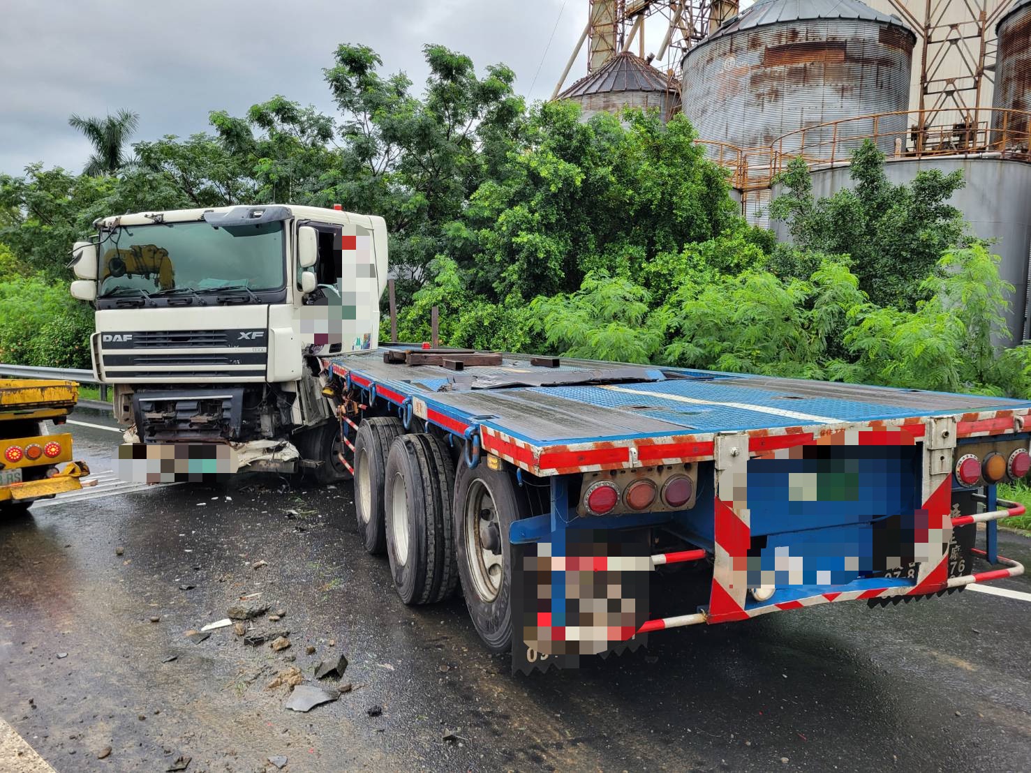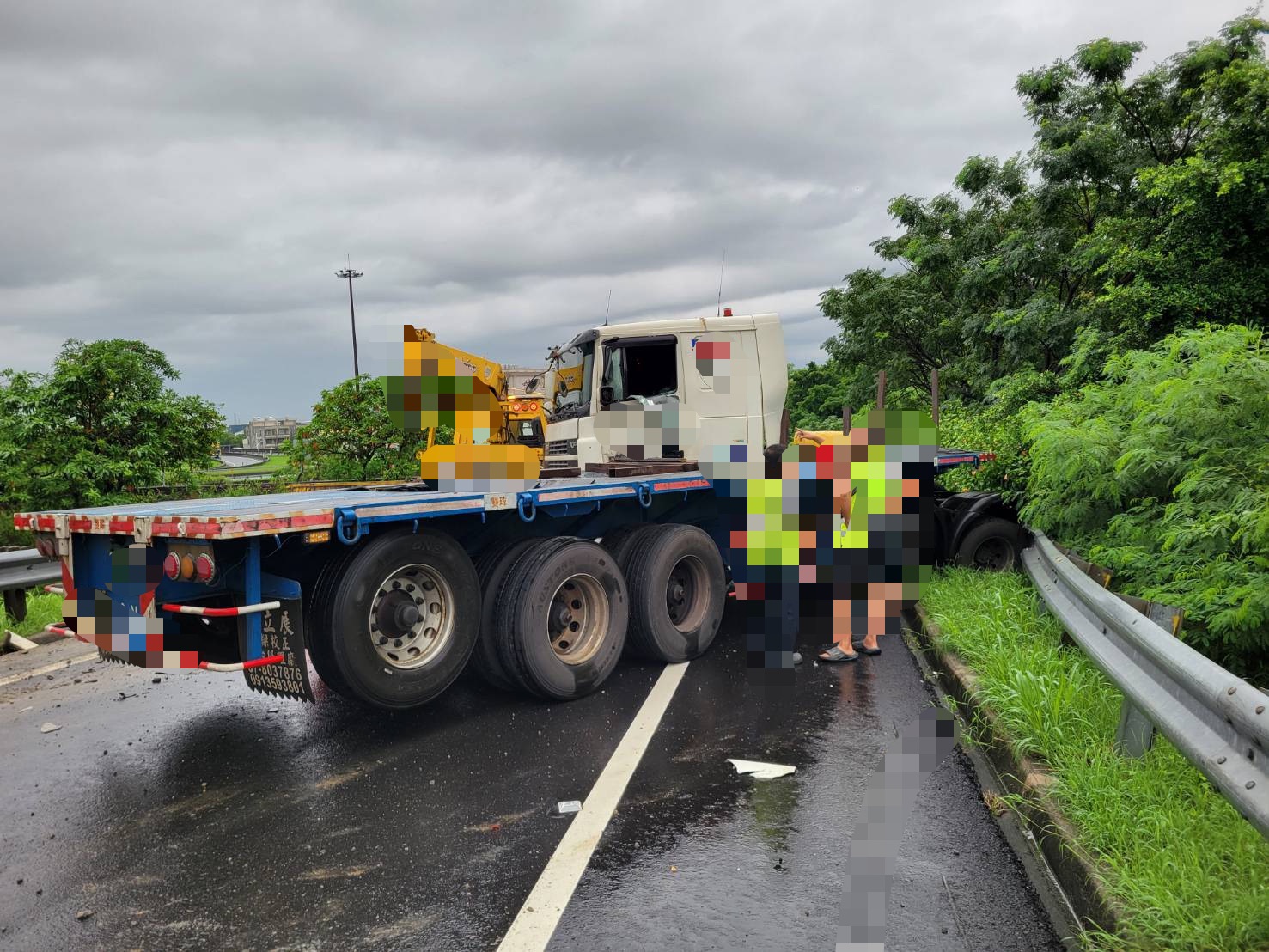 國道1號拖板車自撞護欄「折甘蔗」。翻攝畫面