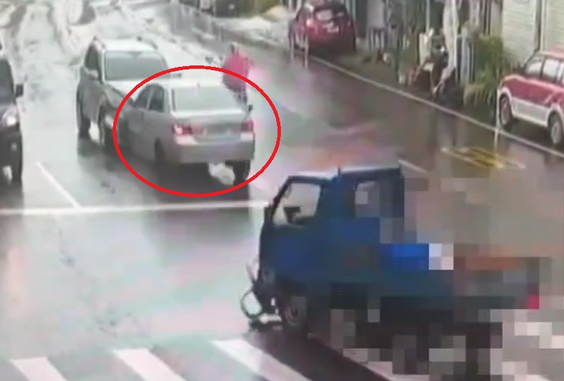 自小客車(紅圈處)闖紅燈造成連環車禍3人受傷。翻攝畫面