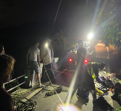 警消人員立即架設繩索下降嘗試搜尋,垂降50米後尋獲年約50歲男子,身上部分撕裂及擦挫傷,發現其尚有意識、對聲音有反應,立即進行SKED打包作業,上方人員後續利用繩索系統將男子拖拉至地面,隨後送往埔里基督教醫院。