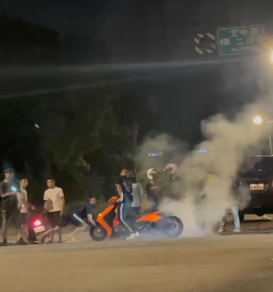 機車燒胎冒出濃煙和巨大聲響。翻攝畫面