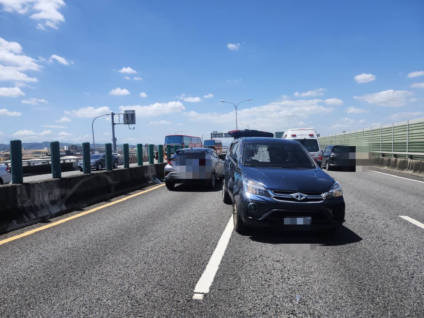 自小客車被推撞到對向車道,撞斷數根中央護欄。翻攝畫面