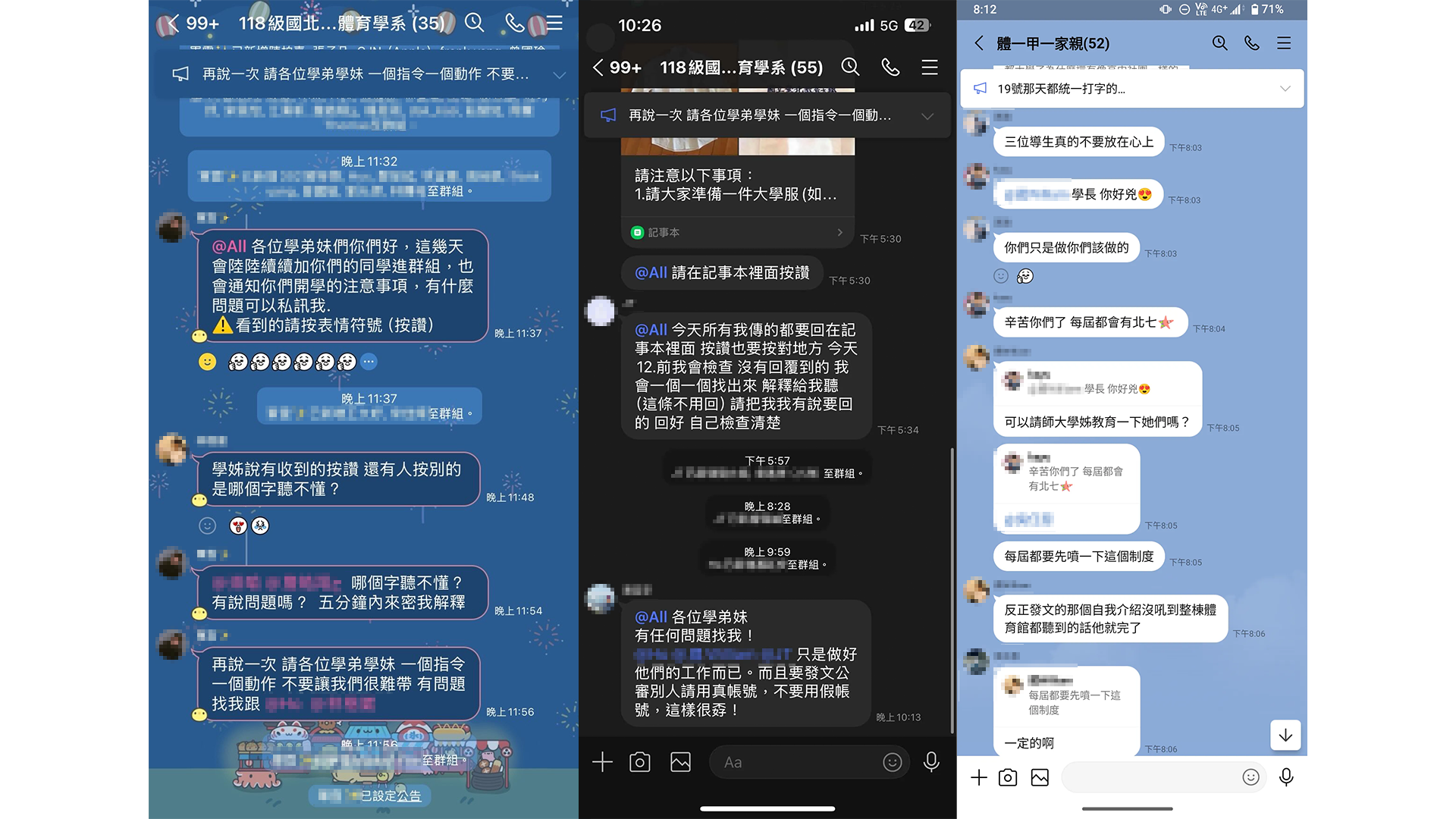 根據流出的對話截圖,有學長姐在群組強調「一個口令一個動作」,並要求所有新生馬上遵守,有人誤按其他符號竟立刻遭公開質問「哪個字看不懂?」還要在五分鐘內私訊解釋。更誇張的是,還有學長在聊天時語帶威脅說「開學進來就先電」,讓不少人質疑這已經不只是要求,而是赤裸裸的霸凌。