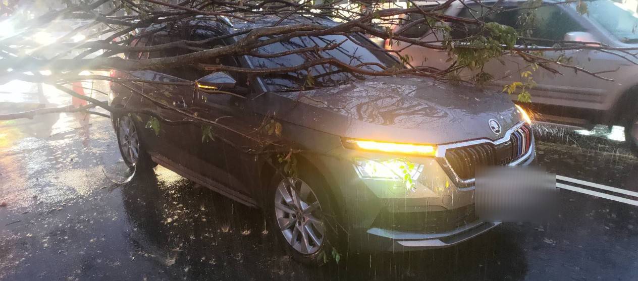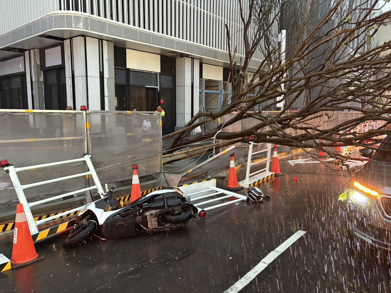 到場回報:現場路樹倒塌壓到自小客車一部,自小客人員無受傷受困;一名機車騎士因閃避不及自摔受傷,男機車騎士左肩、左膝擦傷及左後腦疼痛、意識清楚,送往中國附醫救治。