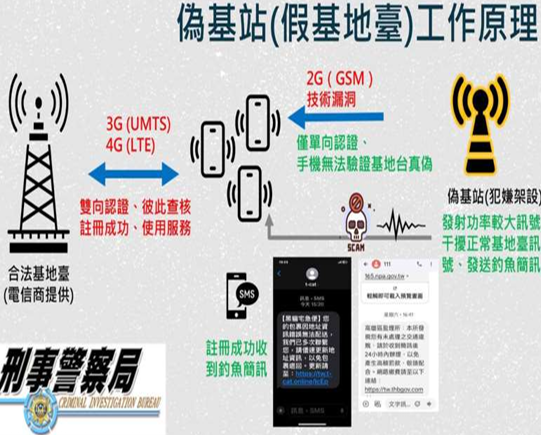 刑事警察局及國家通訊傳播委員會為防制是類詐騙犯罪,與台灣大哥大、中華電信、遠傳電信等行動通訊業者研商建置假基地臺偵測系統,本案查扣之涉案假基地臺係俗稱「偽基站」之陸製設備,可在約100公尺有效範圍內,遮蔽當地電信業者基地臺訊號,每小時發送數千至上萬則釣魚簡訊,並偽冒任意數字組合之簡訊發送號碼,已成為國內詐騙簡訊主要發送管道之一,本案目前清查假冒「iPASS一卡通」及「街口支付」等手法已累計有12位被害人,總財損超過新臺幣40萬元,並持續擴大清查中。