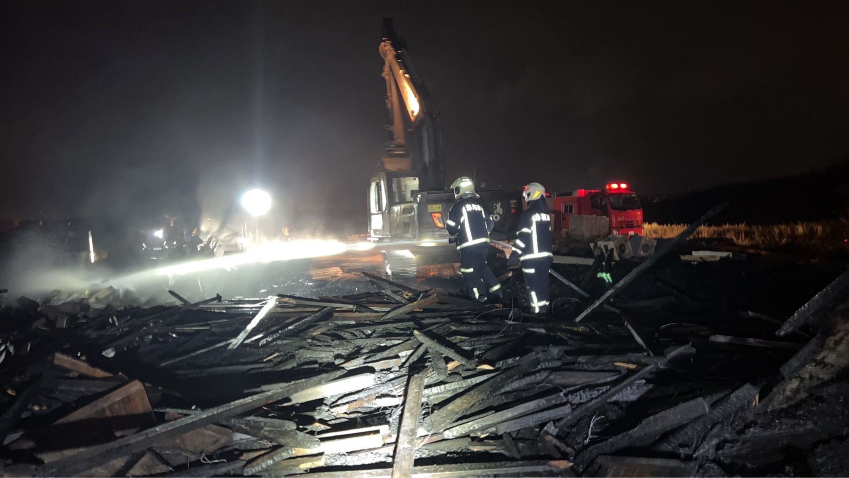消防隊員到場,確認係湖西鄉鼎灣村某營造公司放置建材場所內堆置之木棧板起火燃燒。經部署水線出水搶救,火勢於21時09分控制。22時37分營造公司調度挖掘機1輛,前往配合水線處理悶燒之木棧板。23時33分火勢完全熄滅,燃燒木棧板面積約150平方公尺,另有1輛堆高機遭火勢波及半毀。有關本起火警詳細起火原因及財物損失,刻由消防局火災調查科調查中。