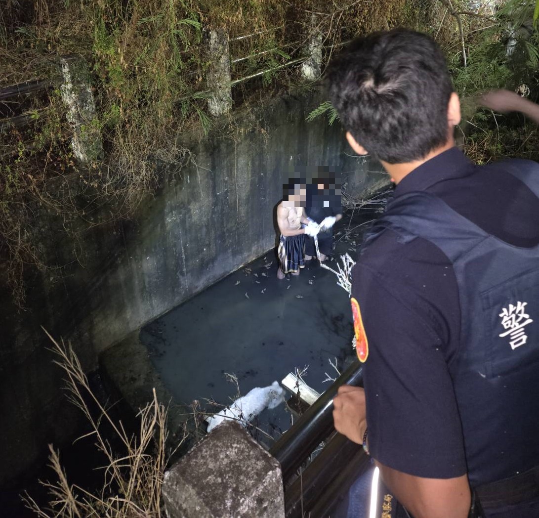 【Lai傳媒、記者爆料網/周庭慶/台中報導】昨(6)日凌晨1時20分,1名民眾經過在沙鹿區龍山路,聽見路旁大排水溝不時發出微弱悲鳴聲,由於地處偏僻且燈光昏暗,聲音讓民眾聽起來毛毛的,但還是好奇趨近探視。結果發現深約3公尺的溝內1隻白色毛小孩半身泡在水中,隨即報警。正巧4名愛狗的大學生經過,眾人準備好梯子嘗試救援,由於現場無燈光視線極為昏暗有安全之虞,員警立即開啓巡邏警示燈及使用強力手電筒照明,2名大學生自告奮勇下去救援。