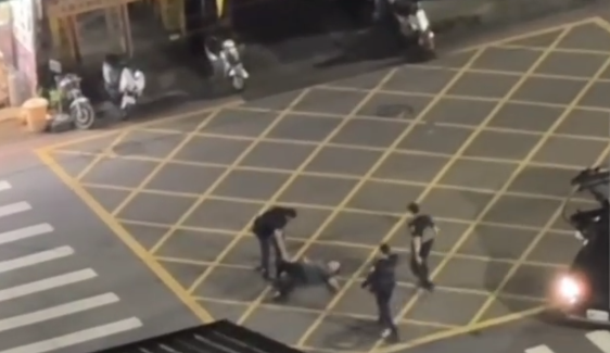 台中一名男子阻止飆仔橫行遭攻擊倒地(紅圈處),員警獲報到場處理及圍捕。翻攝畫面