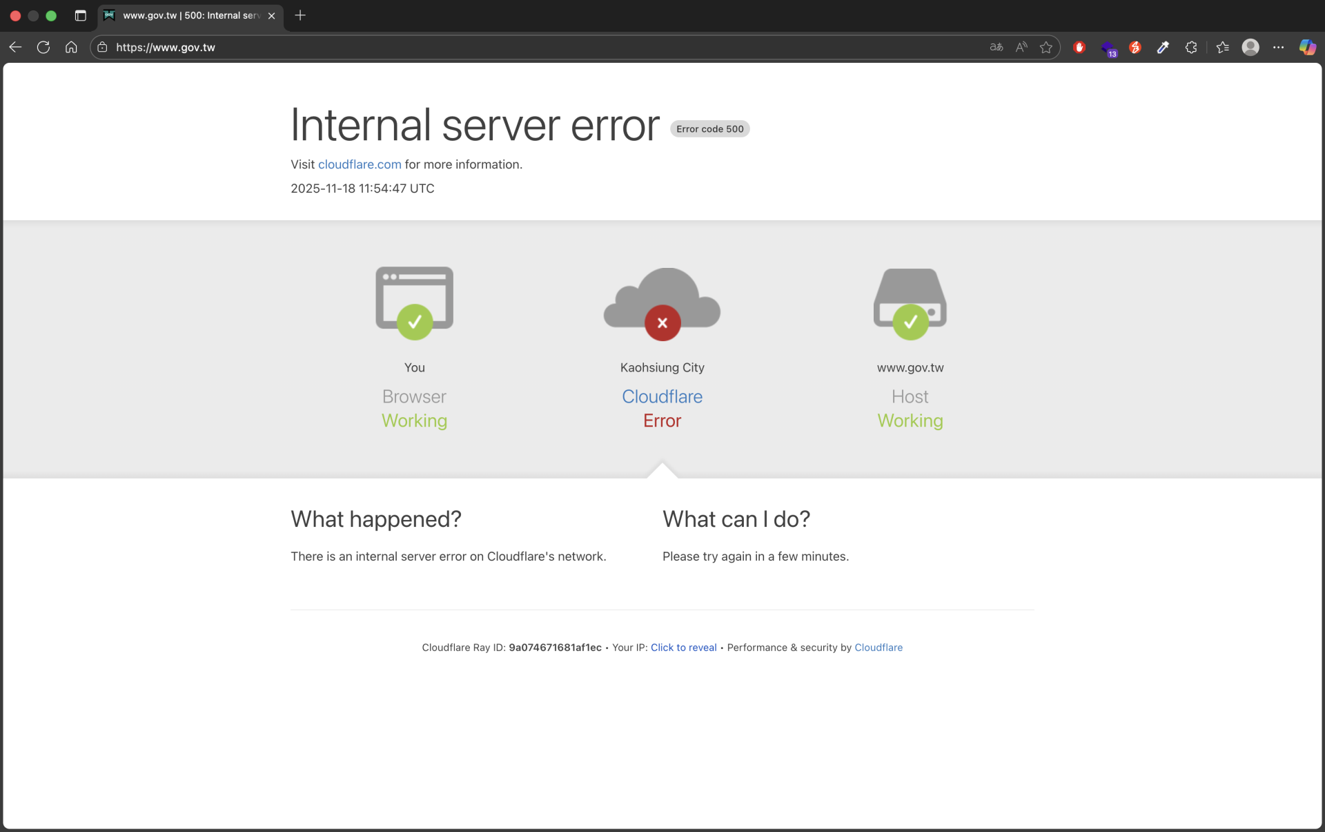 今(18日)晚間台灣時間19:48傳出重大網路災情!全球知名內容傳遞網路(CDN)服務供應商 Cloudflare 稍早發生嚴重故障,導致全球大量網站瞬間癱瘓,頁面僅顯示「500 error」錯誤代碼。這波災情也重創台灣,不只國外平台連不上,連國內許多政府機關網站也驚傳「掛點」無法進入,讓不少正在處理公務或瀏覽網頁的民眾看著螢幕乾著急,網路上已是一片哀號:「以為網路壞了,原來是全球一起掛!」