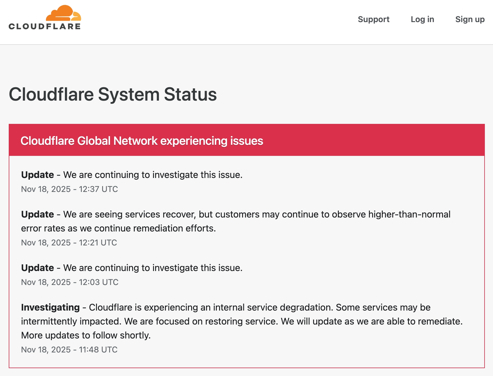 根據 Cloudflare 官方稍早發布的狀態頁面(Status)顯示,這起異常始於台灣時間晚間 7 點 48 分(UTC 11:48)左右。官方隨即發布公告證實,其「全球網路服務」(Global Network)正遭遇障礙。Cloudflare 指出,目前觀測到廣泛的「500 錯誤」(Widespread 500 errors),這通常代表伺服器內部錯誤,導致網頁無法正常顯示。更慘的是,就連 Cloudflare 供客戶使用的儀表板(Dashboard)和 API 介面也全數失靈,管理者想登入後台搶修都沒辦法。