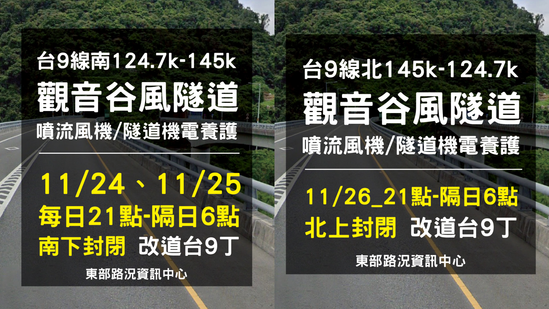 蘇花改將進入夜間密集養護期!公路局東區養護工程分局宣布,為確保觀音、谷風及中仁隧道內噴流風機與各項機電設施的運作安全,將於 11月24日至27日 分階段進行夜間施工,期間將針對南下與北上線辦理封閉管制,請用路人留意改道資訊。