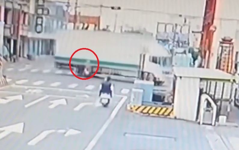 79歲翁騎機車(紅圈處)撞左轉大貨車傷重不治。翻攝畫面