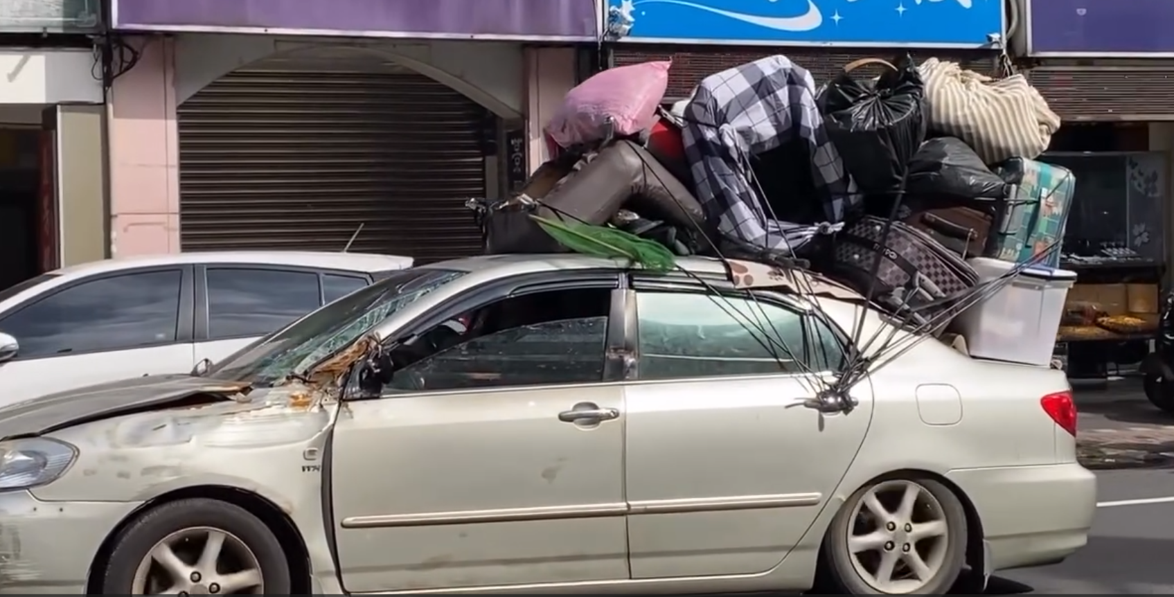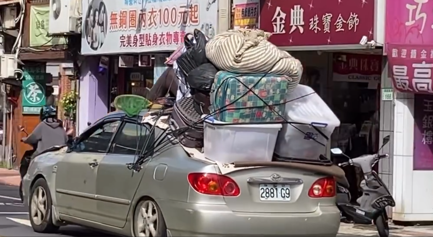 移動城堡車頂堆滿雜物沒有後照鏡照常開上路。翻攝畫面