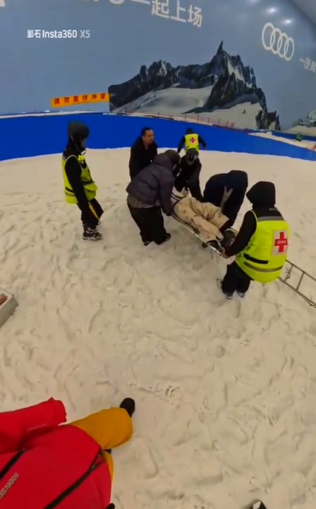 中國一名女子在滑雪場踩著人滑雪,失誤造成腿部骨折。