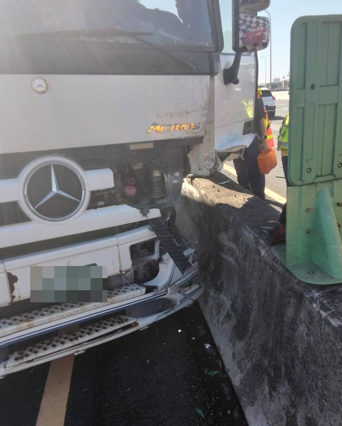 國道警察第一大隊表示,12月1日12時21分左右接獲通報,國道1號北向59.5公里中壢路段有事故,立即調派巡邏車到場查處。經查,24歲何姓男子駕駛貨櫃車載運物品行經該處,右前輪胎突然爆胎,擦撞53歲王姓男子駕駛的小客車與內側護欄,現場無人員受傷,事故造成中央分隔島防眩板掉落於南向內側車道,導致雙向後方回堵約5公里。