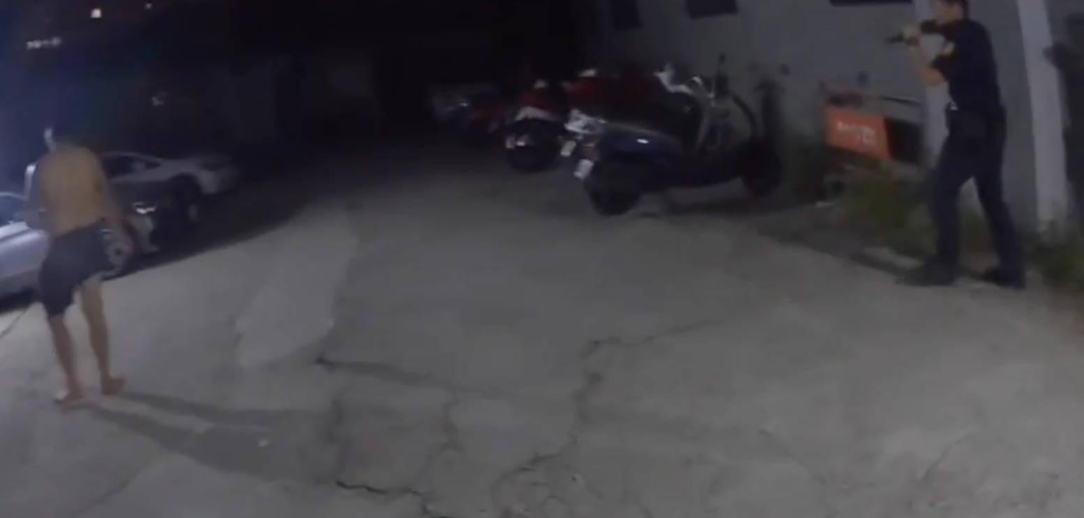 台中一名男子吸後持槍跳入泳池內對人扣板機還砸車,員警到場逮人掏槍喝令他趴下。翻攝畫面