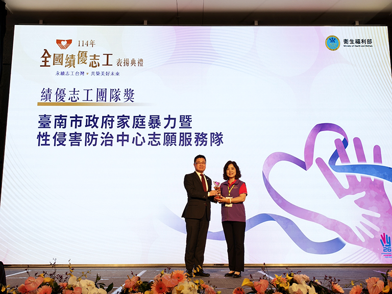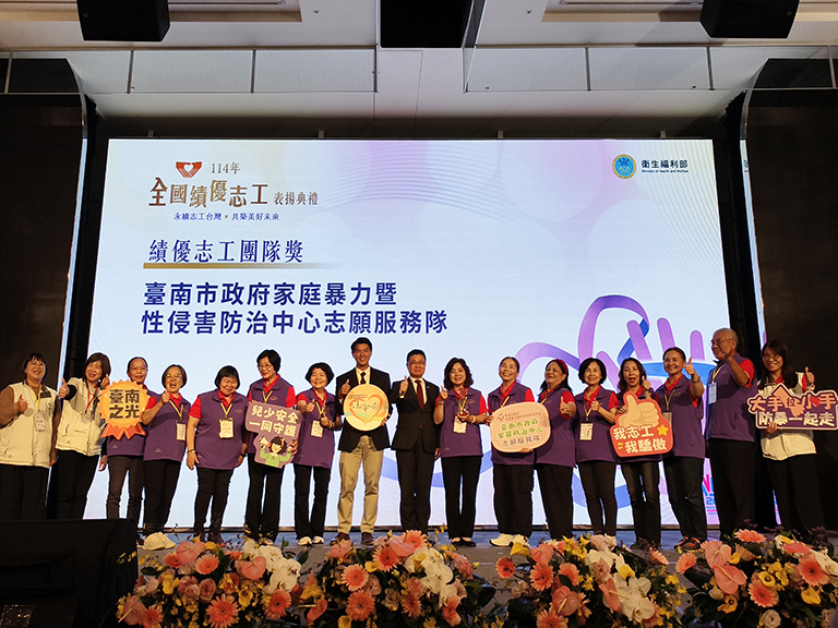 聯合國於西元1985年訂定12月5日為國際志工日(International Volunteer Day),這個節日旨在表揚志工的無私奉獻,並鼓勵更多民眾投入志願服務。衛生福利部響應此理念於11月28日假大直典華幸福大樓舉辦114年全國績優志工表揚典禮,臺南市政府家庭暴力暨性侵害防治中心志願服務隊榮獲「全國績優志工團隊獎」,由衛生福利部呂建德政務次長親自頒獎。黃偉哲市長特獻花祝賀,並由家暴防治中心楊逸宏主任代表到場,感謝志工夥伴長期協助市府投入防治工作。