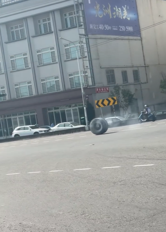 事情發生在今天上午11點多,台南市北區觀海橋路段出現詭異畫面,一顆大型車輪胎竟然在馬路上自己「跑步」!從民眾拍下的影片可以看到,這顆輪胎就像有生命一樣在路上滾動,速度還不慢,最後精準命中一輛停在路口的特斯拉。