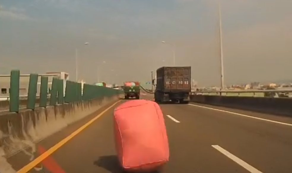 粉紅色的太空包從車上掉落台61線。翻攝畫面