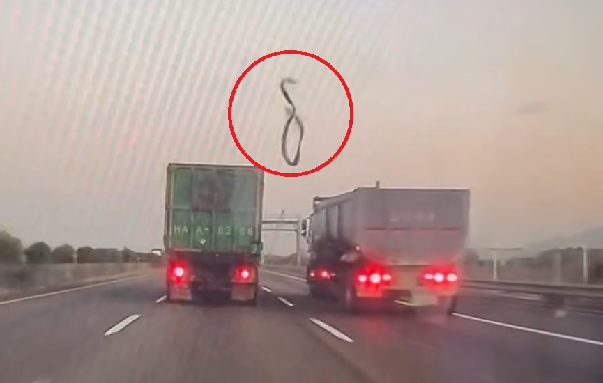 行駛國道大貨車上的膠帶脫落砸中後方車輛(紅圈處)。翻攝畫面