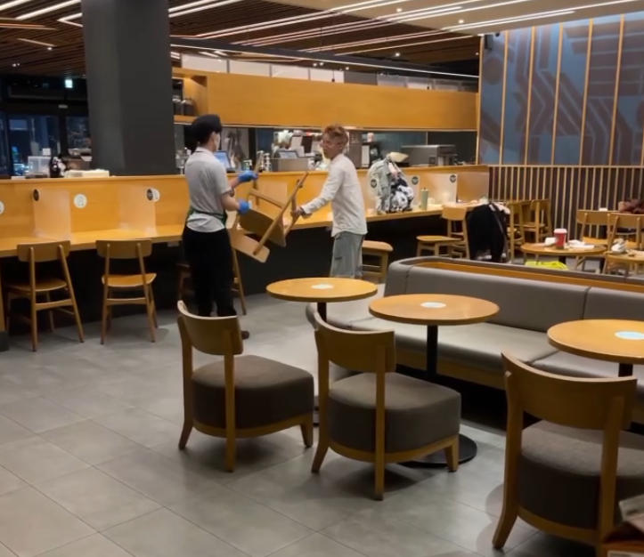 大雅星巴克員工與越籍移工持木椅互砸。翻攝畫面