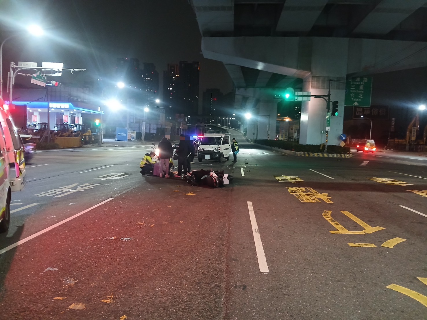 林口分局表示,1月6日0時許獲報新北市泰山區新五路與中港南路口車禍,經查,曾姓男子(70歲)駕小貨車沿新五路高架下閘道至中港南路口時闖紅燈,鄭姓男子(22歲)騎機車載吳姓男子(22歲)沿中港南路往五股工業區方向綠燈直行,兩車於路口碰撞。
