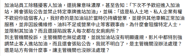 到主管機關投訴,主管機關也無從處理,並說加油站沒有明顯違規,影片中都特別強調禁止客人進站加油,而且還會張貼公告,我就不明白了,是主管機關沒辦法處理?還是站方有做什麼事,讓主管機關也沒辦法處理?